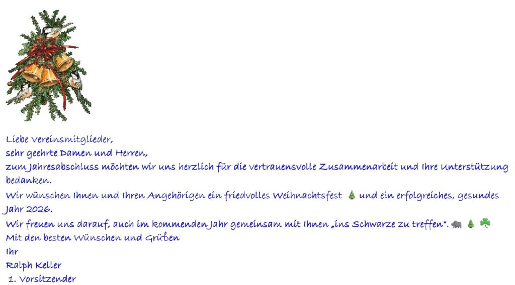 Am 20.12.25 fand unser Weihnachtsschießen der Standaufsichten statt. Die Teilnehmer konnten ihre Schießfertigkeiten bei 3 Übungen mit der Kurzwaffen + Büchse + Flinte unter Beweis stellen. Die Starts waren in 2 Gruppen aufgeteilt : Kleinkaliber und Großkaliber. Erreicht werden konnten 30 Punkte.